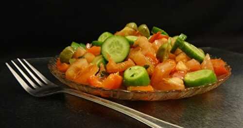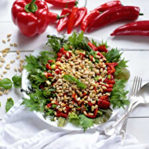 Simple and beautiful salad with roasted pepper and homemade vegan feta.