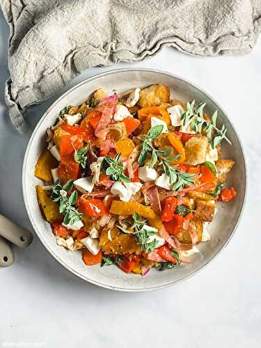 Roasted pepper panzanella is the "not meh" salad you've been waiting for! Have you ever had panzanella? This roasted pepper version is one of our family's