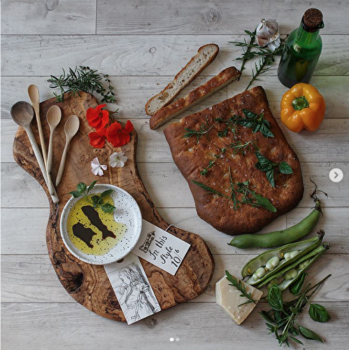 A basic focaccia with the addition of shallots, slowly caramelised in sugar and fig and date balsamic vinegar with rock salt and rosemary.