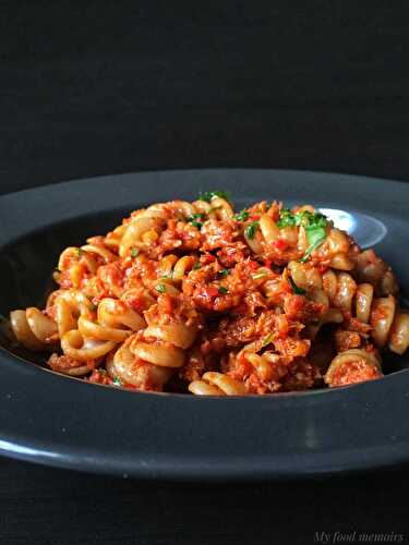 Pasta shells filled with tuna, corn and mascarpone in a spicy tomato sauce with pointed pepper.