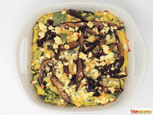 Baked polenta with spinach, balsamic marinated portobello mushrooms, and feta cheese.