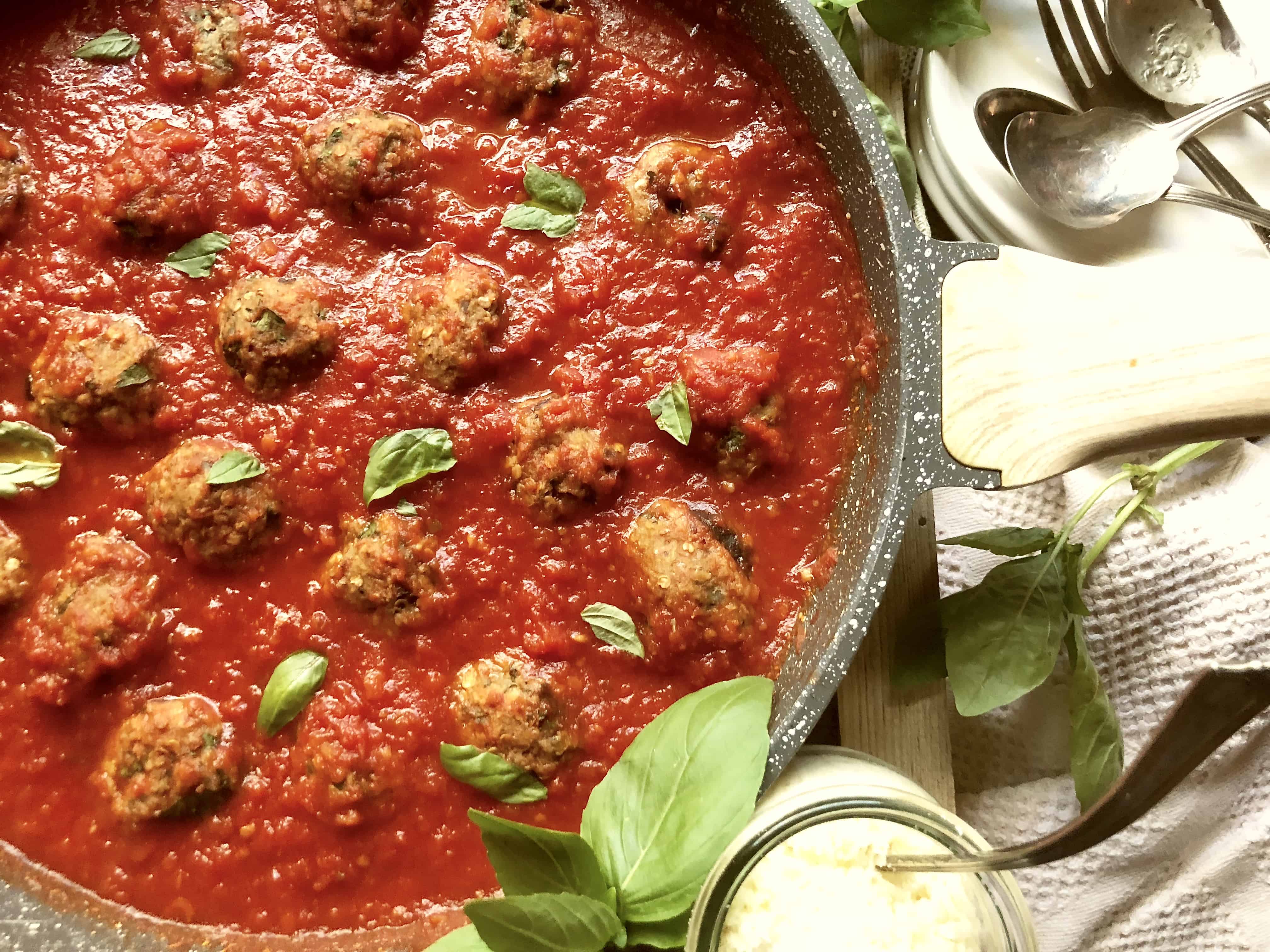 Beef Parmesan meatballs baked in a homemade marinara sauce and topped with mozzarella cheese.