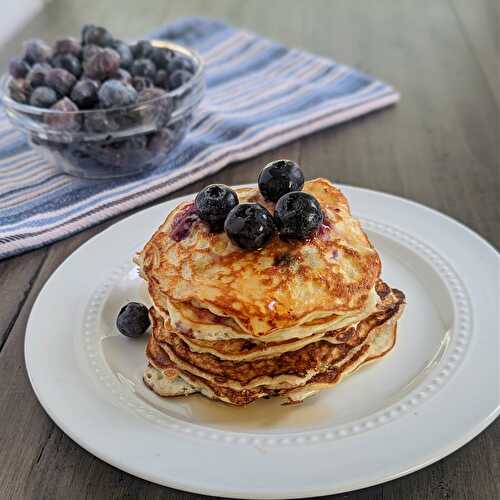 Quick and easy, these gluten free protein blueberry pancakes have liquid egg whites, protein powder, banana and blueberries.