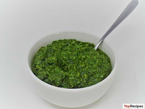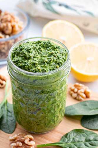 A homemade pesto sauce made with fresh baby spinach, walnuts, garlic, Parmesan, and olive oil.