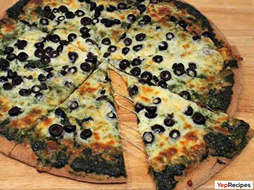 A whole wheat pizza dough topped with homemade spinach and walnut pesto sauce, mozzarella, and black olives.