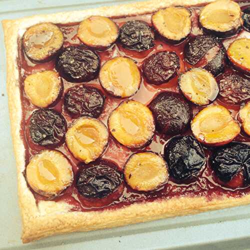 This plum tart known as Zwetschgen-Wähe in German originated in Switzerland and is typically prepared as thin square slices of sweet tart filled with a custard mixture and halved or sliced plums.