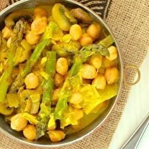 Asparagus-mushroom curry with chickpeas makes a quick, easy, delicous and comforting meal that is also vegan, plant-based, oil-free and gluten free.