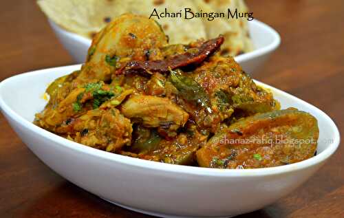 Indian style chicken curry with a combination of eggplant with pickle flavors, to be served hot with freshly steamed rice or roti.