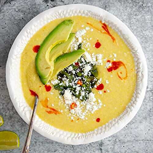 This creamy sweet corn soup recipe highlights tender corn kernels, potatoes, veggies, aromatics, seasonings, and green peppers for a touch of spice and flavor.