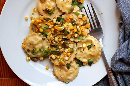 Homemade pasta dough with a sweet corn, jalapeno, ricotta, and goat cheese filling and brown butter sauce! Ravioli from scratch is a snap with this recipe.
