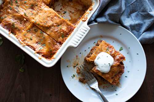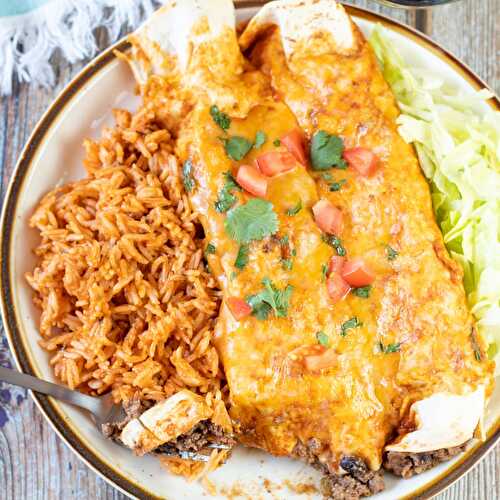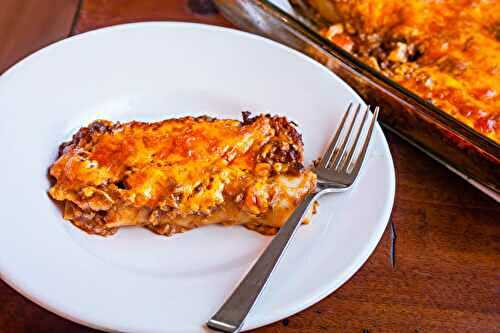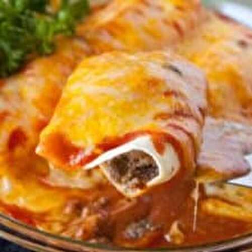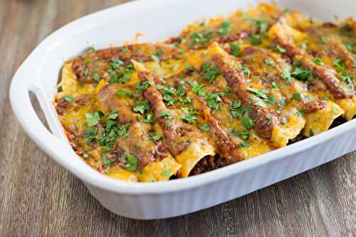 Enchiladas generously stuffed with seasoned ground beef and baked in a homemade spicy enchilada sauce.