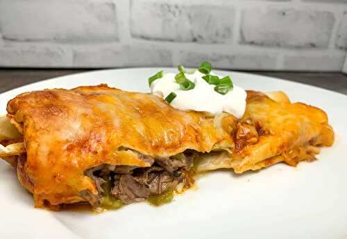 Braised beef short ribs and jalapenos rolled in flour tortillas, topped with a homemade enchilada sauce and Monterey jack cheese, and baked until bubbly.