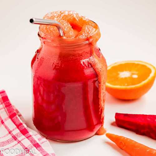 Naturally sweet and vibrant beetroot detox juice recipe with beets, pineapple, carrot, and lime plus soothing ginger.