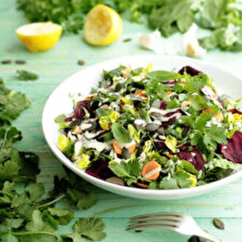Refreshing and filling herb and rice salad with beetroot chips and sweet miso dressing.