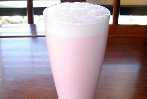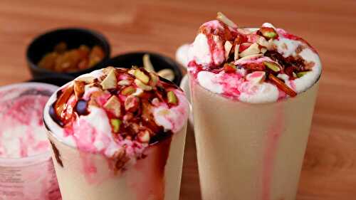 Rose lassi is a refreshing drink made with rose flavored syrup.
