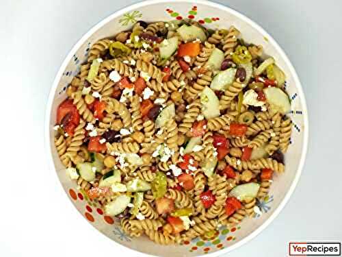 Rotini pasta, chickpeas, olives, cucumber, tomato, bell pepper, peperoncinis, feta cheese tossed with a white balsamic and garlic vinaigrette.