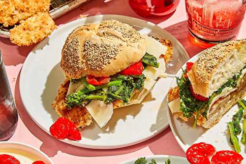 Fried chicken cutlet sandwiches with sharp provolone, broccoli rabe and peppadews.