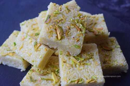 Coconut barfi with milkmaid aka coconut burfi with condensed milk is an immensely popular and super easy Indian sweet recipe that is perfectly suitable for any festival or special occasion.
