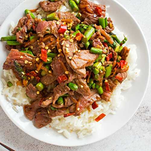 Hunan Beef is a popular, spicy Chinese food take-out dish that is super easy to make at home! This savory and spicy Hunan style beef is made with thinly sliced steak that is stir fried in a garlic and pepper sauce with colorful vegetables.