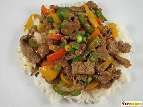 Spicy Chinese dish of marinated thin sliced beef stir fried with veggies and dried chili peppers.