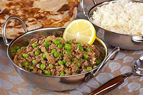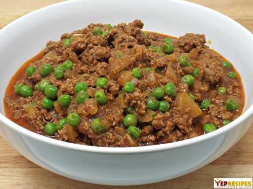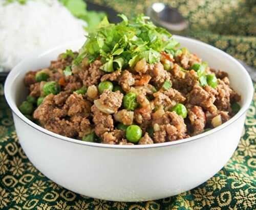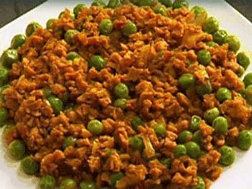 An Indian curry dish consisting of ground meat, peas, and spices.