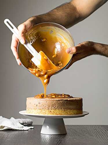 Fluffy vanilla sponge cake, coffee & chocolate mousse, caramel, peanuts.