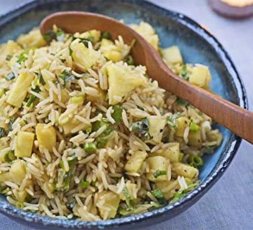 Coconut Milk Rice with Pineapple features tender white rice simmered in a rich bath of coconut milk, resulting in a creamy side dish spiked with the bright taste of pineapple!