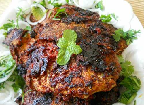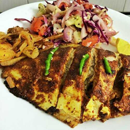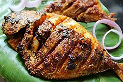 Pomfret fish is marinated with tandoori masala and grilled till crisp golden in an oven or over charcoal tandoor.