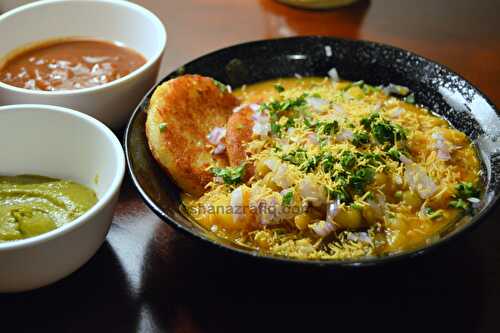 Ragda Pattice is a chat preparation of fried potato cutlets with peas curry, topped with chopped raw onion, coriander leaves and sev.