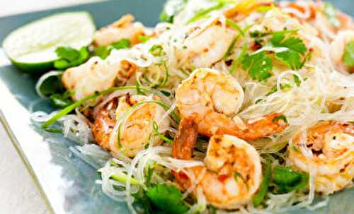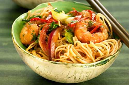 Shrimp and vegetables are cooked with noodles and typical Singapore spices to make this tasty, quick and easy Singapore shrimp noodles recipe
