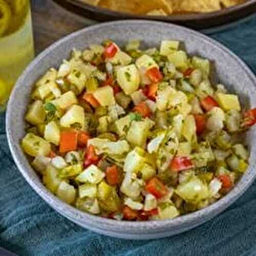 This Pickle De Gallo salsa will rock your taste buds with the fun combination of tangy pickles, pickled jalapenos, and sweet pineapple.