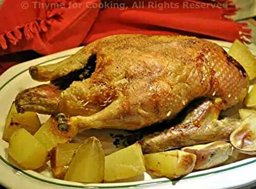 Duck legs are roasted with potatoes and thyme to make this flavor-packed roast duck leg with potatoes dish.