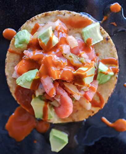Spicy shrimp Tacos made with Indian spiced shrimp, seared and casually laid on a warm mini tortilla or Chapati with a dollop of Indian yogurt Raita Slaw.