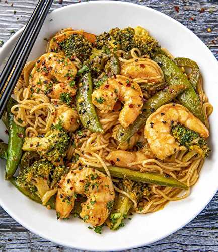 Shrimp and vegetables are cooked with noodles and typical Singapore spices to make this tasty, quick and easy Singapore shrimp noodles recipe