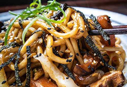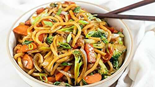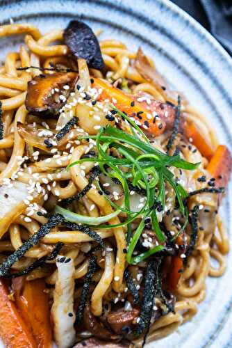 Yaki udon (stir fried udon noodles) is a Japanese favorite recipe that is quick and easy to make, taking only 15 minutes from start to finish! It's packed full of flavor from the thick, chewy udon noodles stir-fried with veggies in a savory sauce.