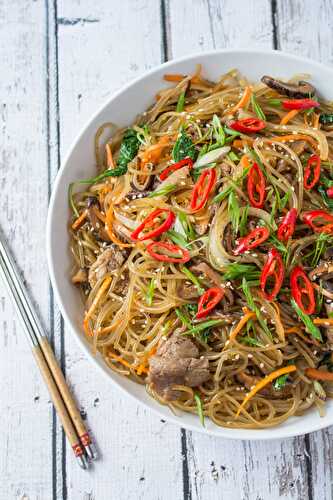 Japchae is a classic Korean dish that can be served as a side, main dish, or over rice.