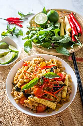 Pad Kee Mao (Thai Drunken Noodles) is a stir-fry that features wide rice noodles tossed in a classic Thai sauce, ground pork or chicken with an assortment of fresh vegetables.