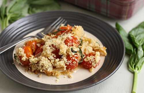 Cherry tomato crumble, with melty mozzarella, fresh basil, and an oaty crumble topping.