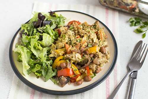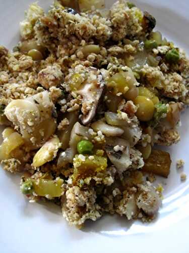 Bean and vegetable crumble with cheesy pesto crumb - heaps of flavour, with loads of veggies and crispy cheese! It's a great fridge clearer, just use whatever veg you have to hand.
