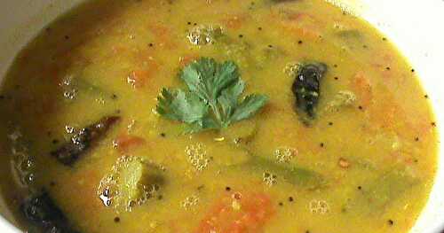 South Indian Sambar is a lentil based vegetable stew made with Toor Dal (Pigeon Peas) and assorted healthy vegetables like drumsticks and bottle gourd (Lauki).