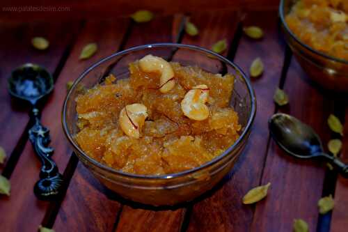 Easy pumpkin halwa recipe flavoured with cardamom and dry nuts.