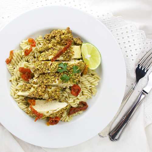 Pistachio crusted chicken breast on lime and olive oil quinoa fusilli topped with bits of dried tomatoes is a nice crunchy bite for any pistachio lovers.
