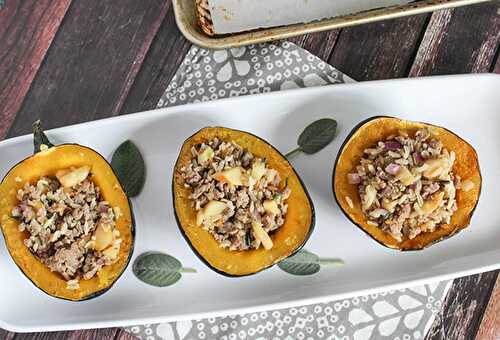 Baked stuffed acorn squash with sausage and apples is sweet, savory and has all of the flavors of fall.