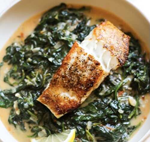A bed of lightly creamed spinach that’s studded with red peppers creates the based for seared white fish.
