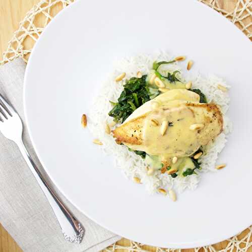 Healthy Chicken Florentine is a grilled chicken breast served on a spinach bed with unctuous Mornay sauce and extra grilled pine nuts.