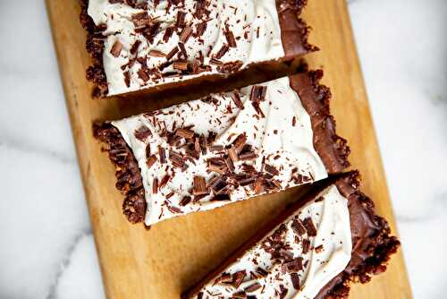 This easy, no-bake vegan chocolate tart has a rich and creamy chocolate pudding center and a press-in date and pecan crust.