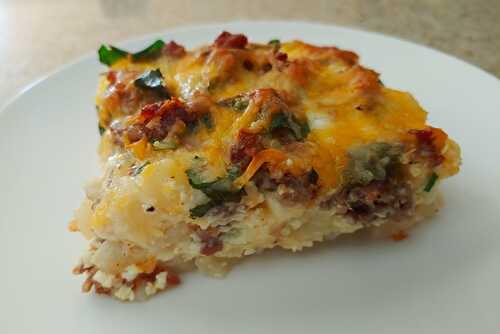 Cheesy Sausage Breakfast Casserole is a perfect breakfast bake made with eggs, sausage, cheddar, baby spinach, and potatoes o'brien.