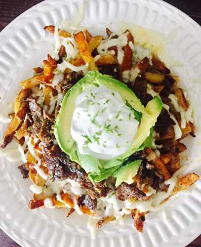 Homemade french fries with delicious, Mexican flavored steak and favorite Latin American sides on top! This dish is honestly in my top 5 favorite foods …