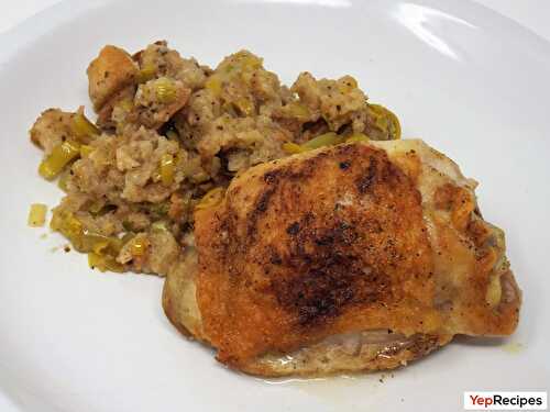 Pan-seared chicken thighs roasted on top of a homemade leek and sage stuffing.