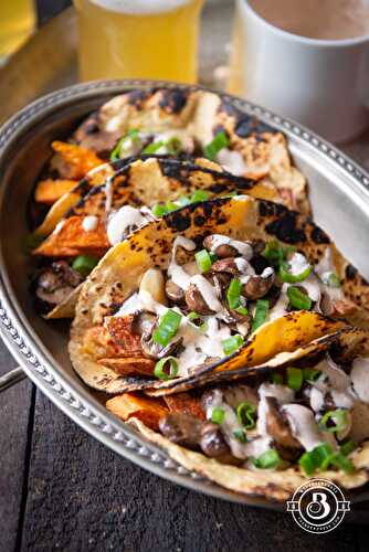 Crispy Sweet Potato and Mushroom Confit Tacos with Smoky Crema Hey, friend.